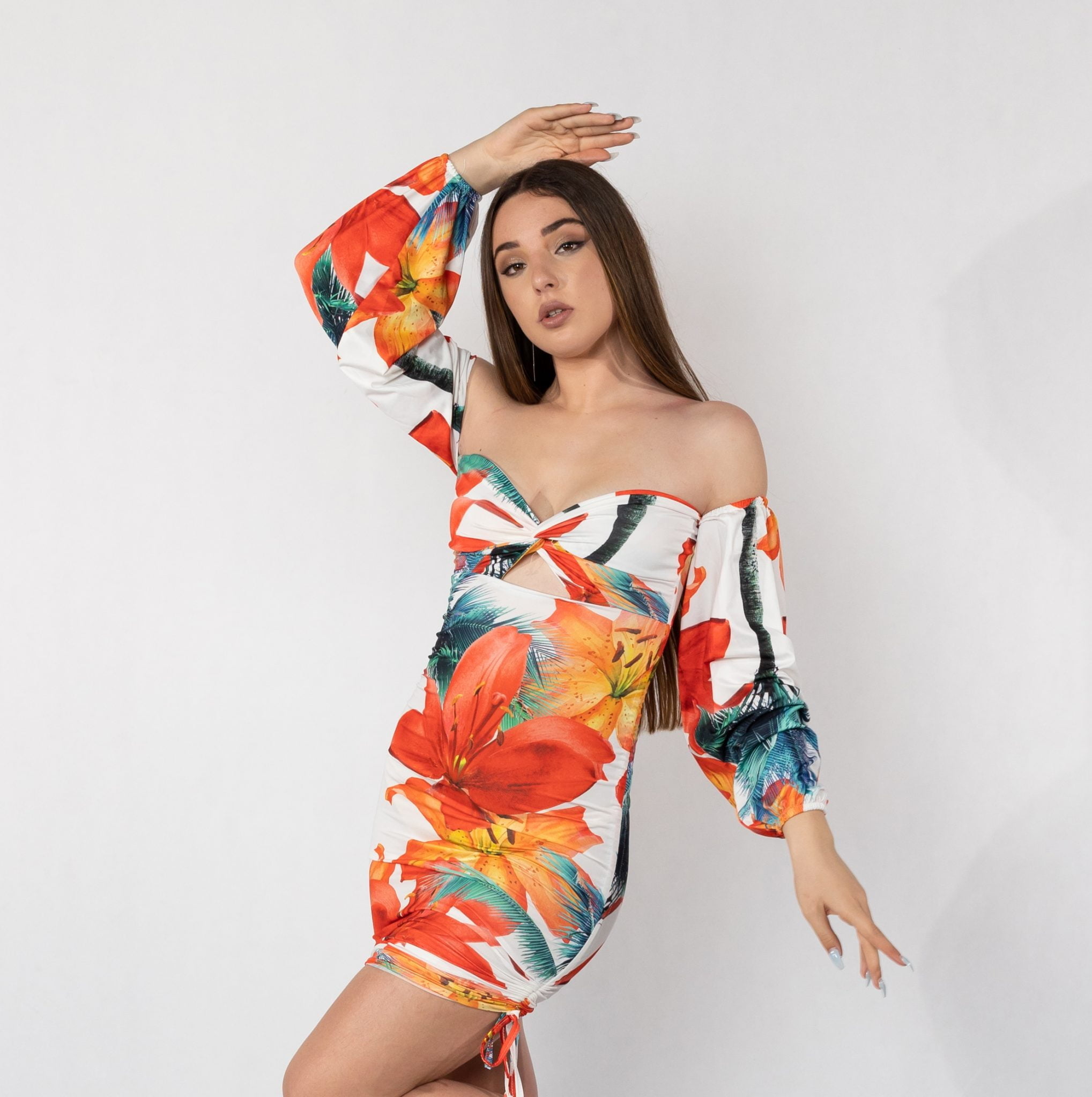 Fustan I shkurter me meng te varura te gjata, me prerje te pjesa e gjoksit dhe me detaj te hapur, me llastik ne dy pjeset anesore